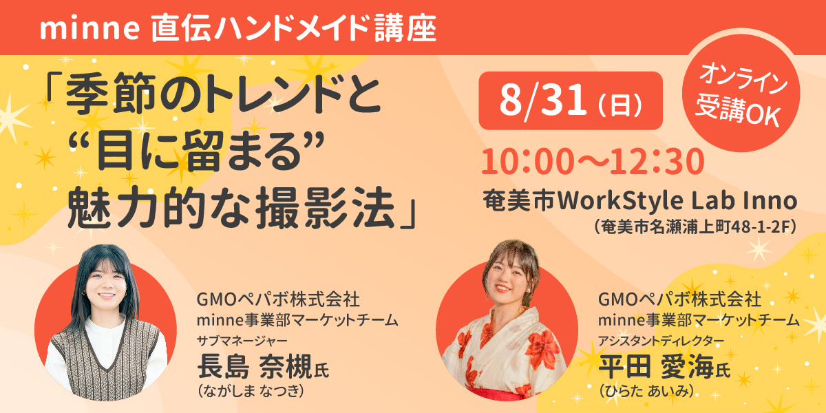 講師:長島 奈槻 (ながしま なつき)氏 (GMOペパボ株式会社 minne事業部マーケットチーム サブマネージャー)、平田 愛海(ひらた あいみ)氏 (GMOペパボ株式会社 minne事業部マーケットチーム アシスタントディレクター)