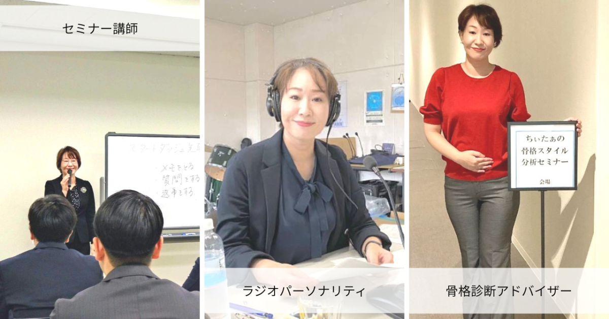 接遇マナー講師としてセミナーや企業研修を行うほか、結婚式司会、骨格スタイル分析、ラジオパーソナリティなど、さまざまな活動でご活躍されています。